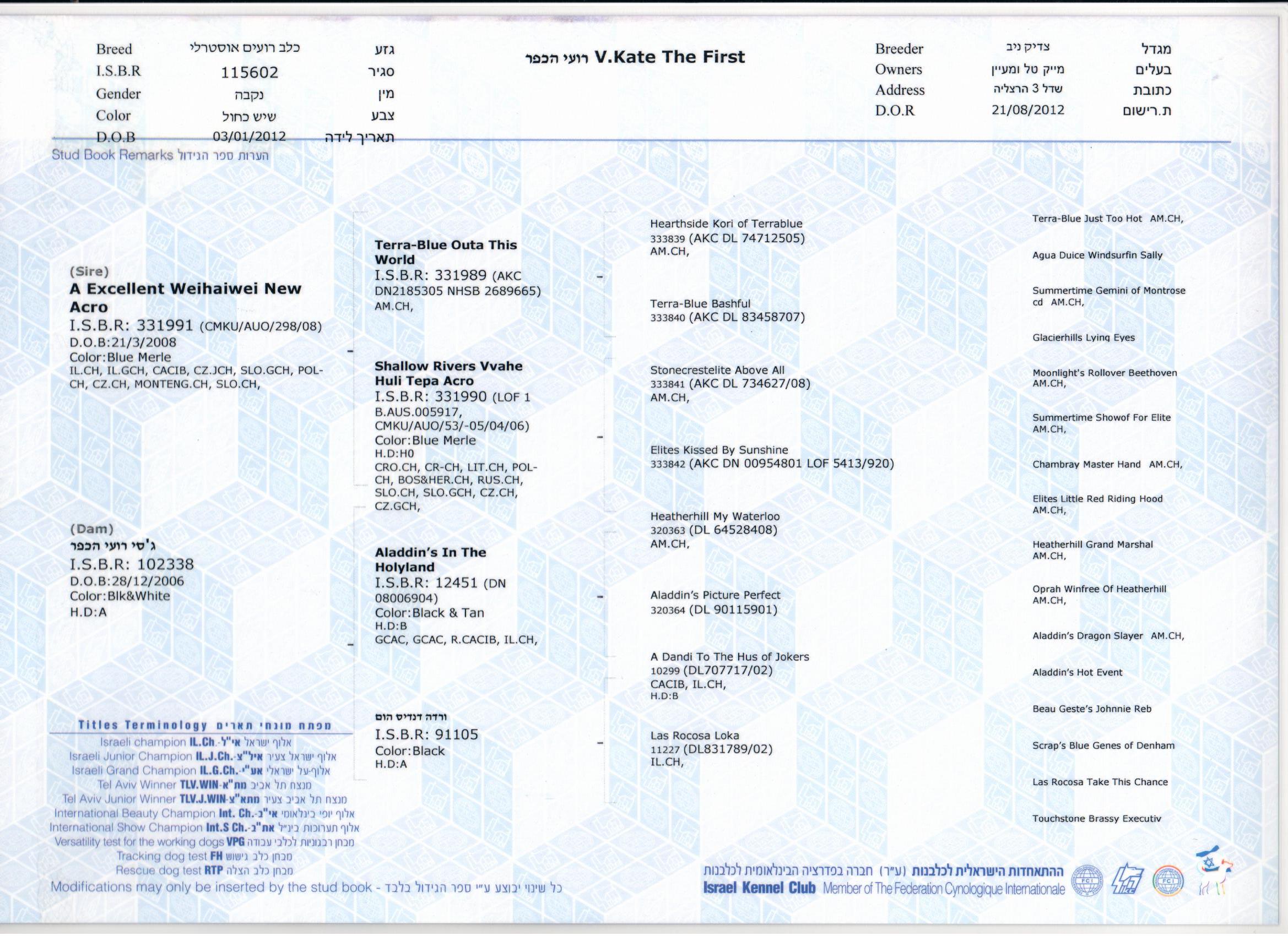 הנקבה שלנו, קייט, רועה אוסטרלית בלו-מרל (שיש כחול), הינה כלבה מבית גידול מובחר בישראל וגם לה קו-דם מלכותי, נצר לשושלת רועים אוסטרליים אלופים ועתירי תארים משלל תערוכות בארץ ובאירופה